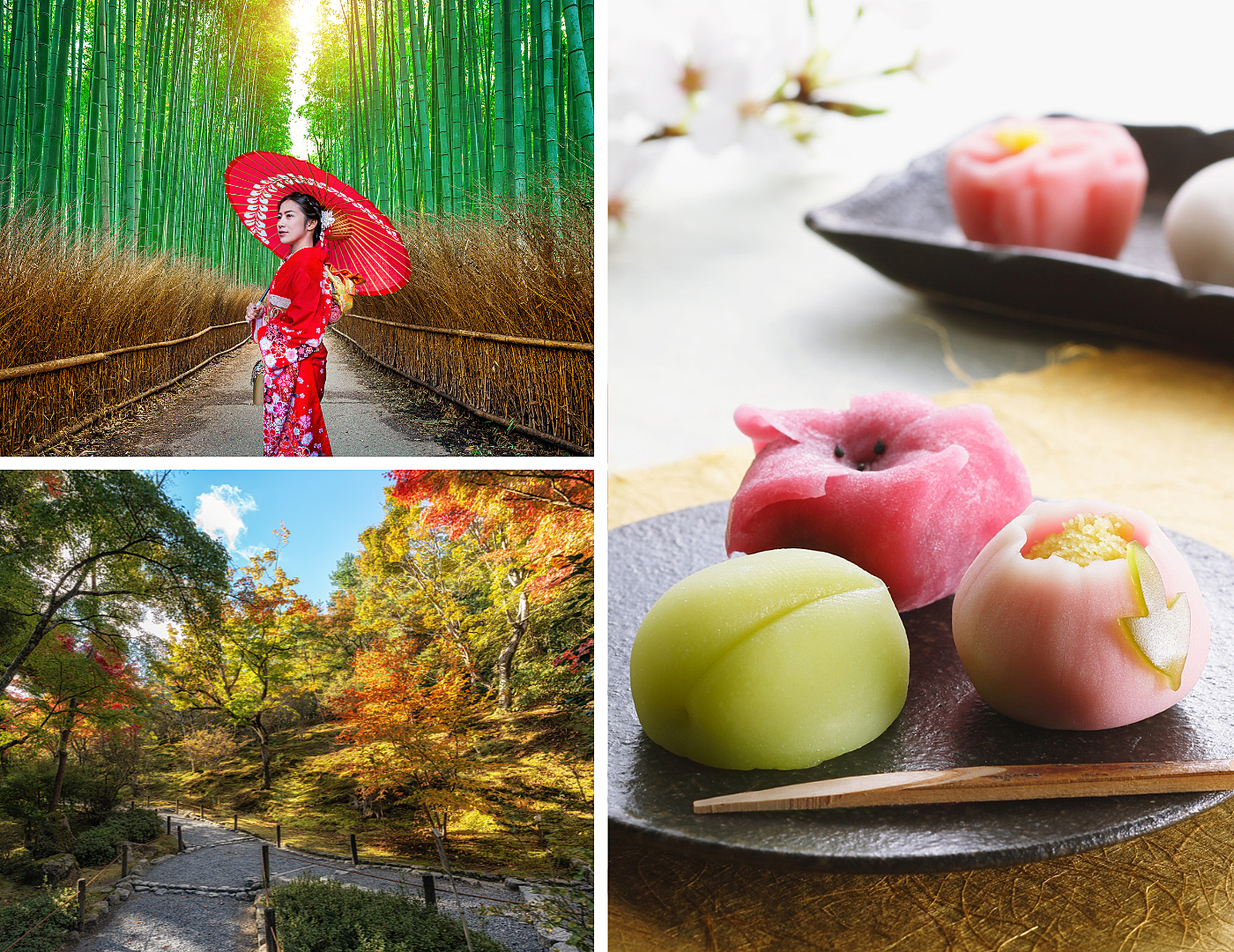 Arashiyama Bamboo Forest (top left), Tenryu-ji Temple (bottom left), a selection of Japanese sweets (right).
